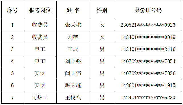 根據鑫富源人力資源公司2026年1月30日、2月3日分別發布的《晉中市某醫院收費員招聘公告》、《晉中市某醫院收費員招聘補充公告》、《晉中市某醫院后勤工作人員招聘公告》相關要求,經過網上報名、資格審查、綜合面試、體檢等環節,現對擬錄用人員予以公示,具體如下: