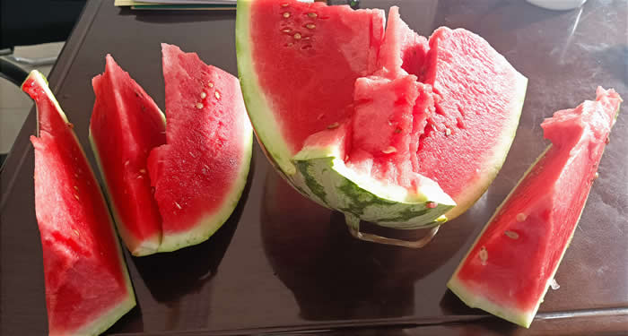 為了能讓每一位員工都能吃到清爽解渴的西瓜,領到西瓜在車間休息區將西瓜逐個切完、擺好,并通知員工輪流到休息區吃瓜。對于那些因忙碌無法離崗的員工,車間更是貼心的送到員工手中。
