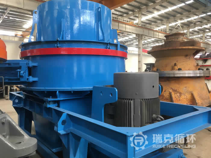 4.、設備情況:2019年7月我公司在山東某地將該臺PLS850立式沖擊破碎機(制砂機)回收,設備從購買之后一直從事鵝卵石的制砂工作,由于該設備生產的環境比較潮濕,機身上有多處銹跡,我公司技術在現場檢修沒有其它的問題之后將運回公司。設備運回公司之后對該設備進行之后,將設備整體拆,然后復檢零部件的實際使用情況,根據設備的實際情況制定再制造方案,易損件更換之后,對其它有磨損的零部件進行修復,完成再制造之后重新安裝調整配合間隙,然后進行試機,試機中該設備的性能非常穩定,符合行業標準,并且已經完成了重新噴漆。