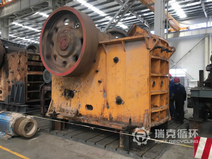 該臺900×1200顎式破碎機是我公司2019年底在甘肅某地回收的,客戶與我公司達成回收協議之后,我公司技術人員就趕往甘肅現場對設備進行檢查,沒有發現設備有重大損壞之后,在現場指導將設備拆開分體運回公司。設備運回公司之后技術人員用測量儀器檢查了該設備各個零部件的實際使用情況,然后下發檢修通知。完成檢修之后在我公司試機平臺上進行試機運行,在整個試機過程中該設備運行的非常穩定,各項運行數據也符合要求,完成試機之后重新進行噴漆。