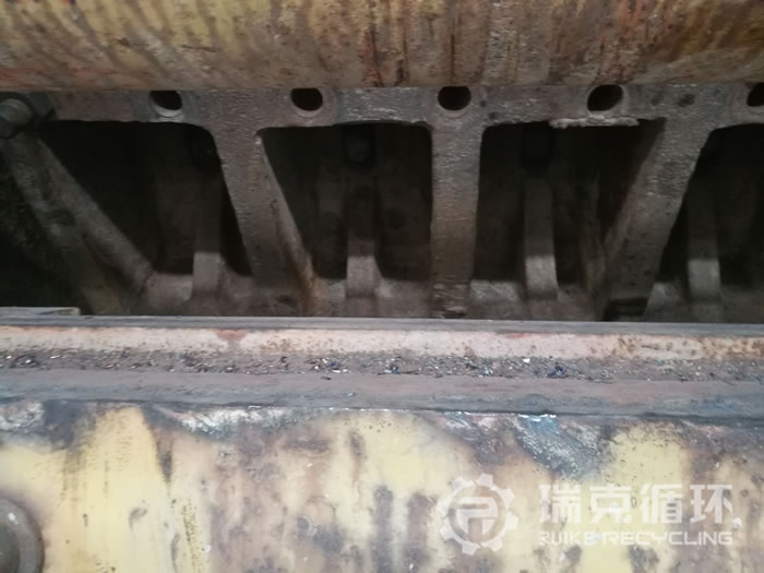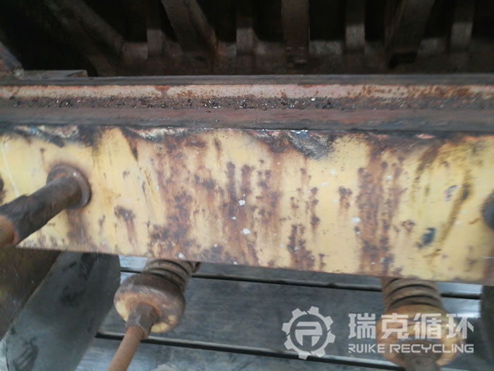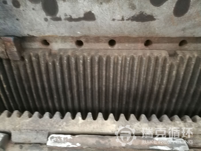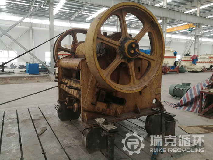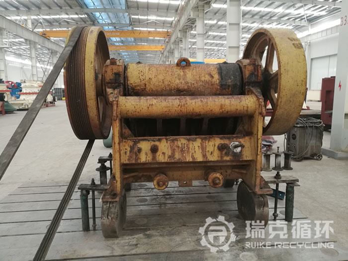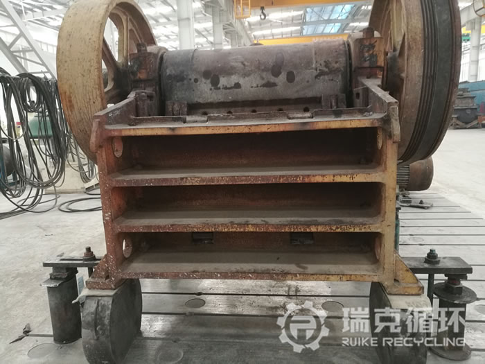 4.設備使用情況:該設備是洛陽大華重工生產的,受環(huán)保影響砂石廠停工,此設備閑置。在2017年10月被洛陽瑞克循環(huán)在宜陽縣某砂石廠回收并進行修復。設備回收后,經技術人員拆分清洗后檢查發(fā)現,電機完好無損傷,整機漆面完整有銹跡,機架完好,機架安裝軸承內孔磨損,動顎軸承座有磨損,動顎鉤角損傷,前肘板墊損壞,其余各部位均完好。經過研究后決定修復方案為將機架安裝軸承內孔補焊并加工,動顎鉤角補焊加工,動顎軸承座補焊并加工,前肘板墊換新。修復后重新安裝成整機,試機情況經檢驗合格。