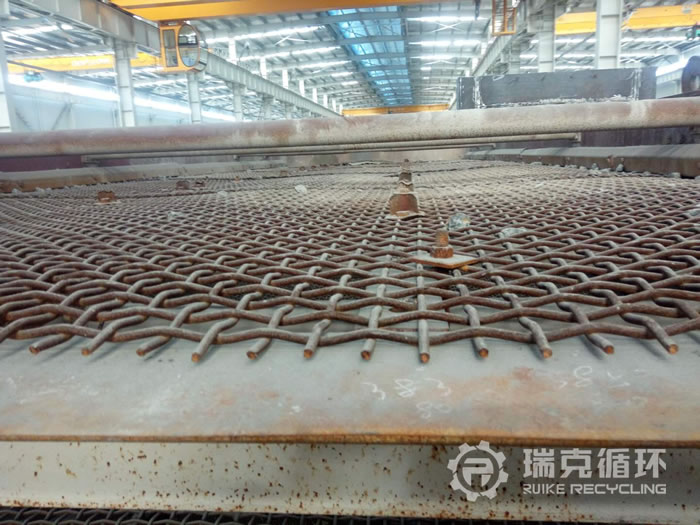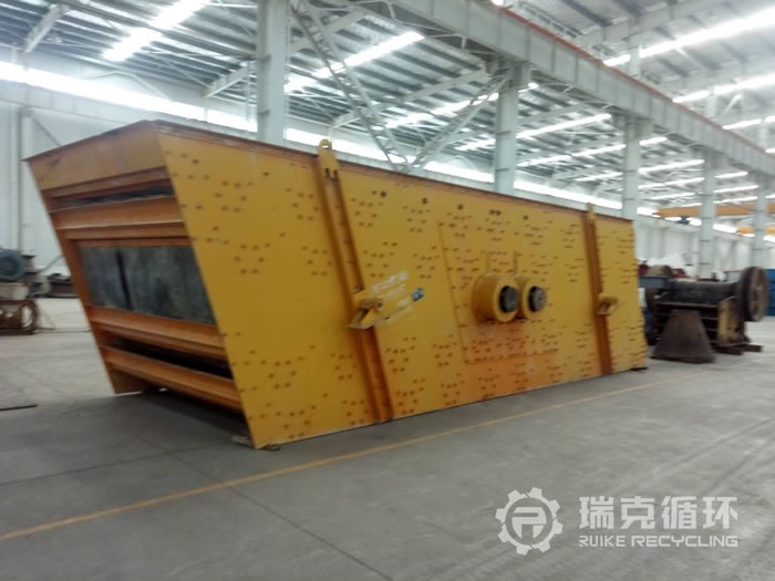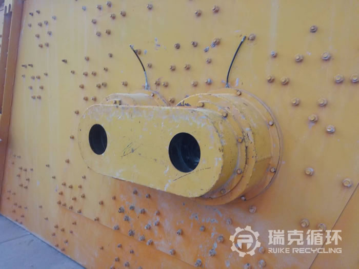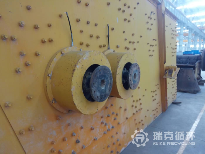 5.設備使用情況:這臺振動篩是某砂石廠破碎青石后用來篩分青石的,經過現場安裝和調試后投入使用,后來由于環保問題以及手續不齊全,導致了該廠停產,該振動篩也閑置起來。后來被銷售經理發現,經過現場考察,發現該臺振動篩外觀完好,9成新,在該廠短短使用過程中只是更換過篩網,沒有其它維修記錄,隨后被洛陽瑞克循環回收回來。清洗后,公司對振動篩進行了檢測,發展偏心塊主軸完好無磨損、軸承座和篩箱、撓性片(輪胎式聯軸器)均完好,公司更換了油脂進行試機振幅8mm,無橫振、振幅不均勻及軸承發熱等問題。