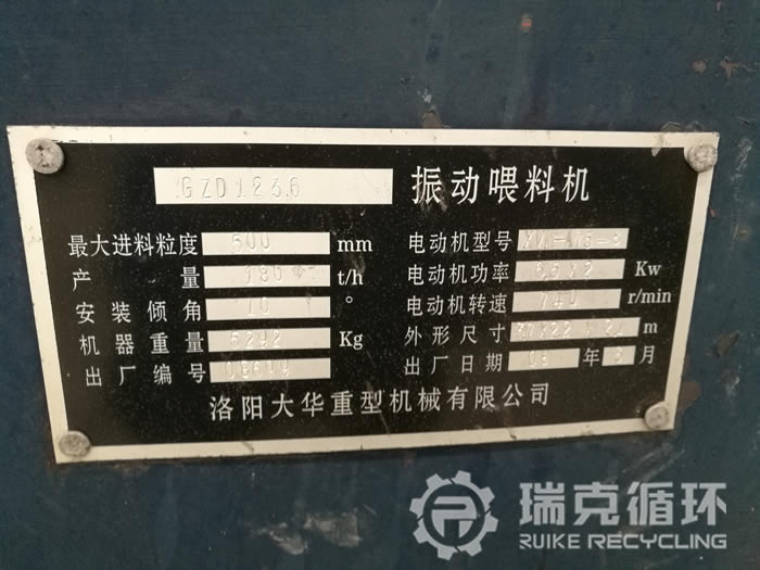 5.設(shè)備使用情況:此臺(tái)給料機(jī)出廠2008年,是洛陽(yáng)大華重機(jī)生產(chǎn)的,被售往陜西后用于砂石料的給料作業(yè)。雖然出廠日期比較早,但是使用期不長(zhǎng)就因企業(yè)擴(kuò)大規(guī)模被閑置下來(lái),整機(jī)無(wú)損傷等情況出現(xiàn)。2018年年初被大華重機(jī)子公司瑞克循環(huán)回收進(jìn)行維修保養(yǎng),待質(zhì)檢人員檢驗(yàn)合格之后進(jìn)行出售。設(shè)備回收時(shí),經(jīng)技術(shù)人員檢驗(yàn)發(fā)現(xiàn),整機(jī)完好、漆面完整,激振器完好、振動(dòng)體完整、振動(dòng)機(jī)架完好、彈簧完整、篩板完好,軸承等均無(wú)明顯磨損;根據(jù)此情況,技術(shù)人員對(duì)其進(jìn)行保養(yǎng)維護(hù)后試機(jī),試機(jī)完好后將進(jìn)行再次出售。