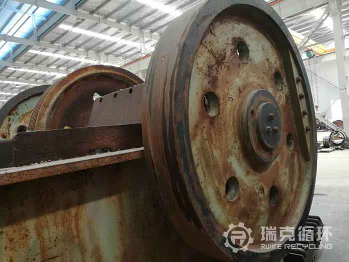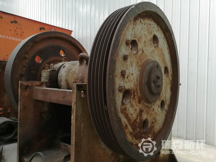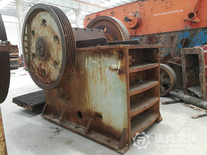 此臺顎式破碎機型號為:600x900,原使用于某砂石石料廠,2017年8月因企業轉型被拆除,拆除之前仍在生產線上從事河卵石的破碎作業。拆除后,閑置了一段時間被洛陽瑞克循環回收。設備回收時,外觀良好,無大面積腐蝕掉漆現象,僅有部分銹跡。清洗拆分后,經質檢人員檢測后得出如下結果:動顎部完整、主軸、軸承、軸承座、軸承內孔均完好;飛輪、皮帶輪狀態良好;機架完整無破損、維修痕跡;除潤煥油脂需更換外,其余各部位均可正常使用。根據檢測結果,我方技術人員對此臺設備給出相關維修方案,更換油脂潤煥、進行維修保養和部分螺栓的換新。維修后重新組裝進行試機,試機合格后,即可噴漆出售。