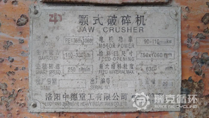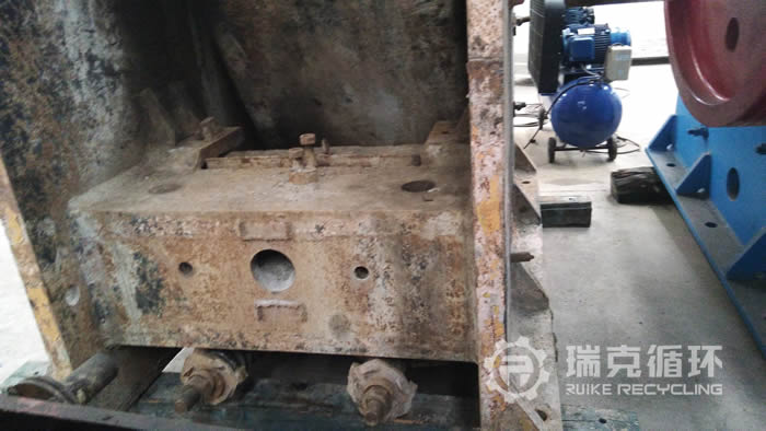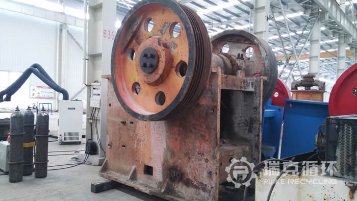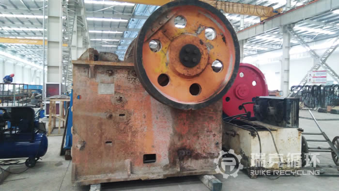 該臺PE750x1060顎式破碎機在河北某地從事青石的破碎工作,在使用過程中性能非常的良好,除了更換易損件以外沒有出現過其它的故障,2018年9月被我公司收購,設備到廠以后公司技術人員對該臺設備進行檢測,外觀除了有銹跡以外沒有其它的損傷,隨后將該臺設備拆機檢查,發現機架完好、動顎完好、偏心軸完好、皮帶輪、飛輪均無損傷,襯板有損壞的地方,根據實際檢查的情況,做出了維修方案:更換損壞的襯板,對軸承座、動顎主軸等進行保養,把該臺設備的銹跡清除干凈并做防銹處理。維修完成之后把設備進行組裝,試機合格后準備噴漆銷售。