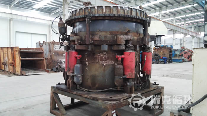 該臺(tái)HPC220圓錐破碎機(jī)是我公司于2018年9月在山東某地回收的,設(shè)備運(yùn)回公司以后對(duì)該臺(tái)設(shè)備進(jìn)行了拆機(jī)檢查,仔細(xì)檢查每一個(gè)零部件的使用情況,發(fā)現(xiàn)動(dòng)錐完好、頂部軸承完好、主軸也完好,軸套、錐套和襯板有磨損,其它零部件都比較完好,然后根據(jù)檢查見(jiàn)過(guò)做出維修方案,更換軸套、錐套和襯板等易損件,其它零部件進(jìn)行保養(yǎng),完成維修工作之后進(jìn)行試機(jī),在數(shù)個(gè)小時(shí)的試機(jī)中該臺(tái)HPC220圓錐破碎機(jī)運(yùn)行的非常穩(wěn)定,各項(xiàng)性能也都符合要求,完成試機(jī)以后等待噴漆。