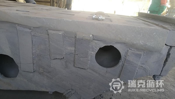 2、 動(dòng)顎體:內(nèi)孔磨損嚴(yán)重,補(bǔ)焊再加工;動(dòng)顎側(cè)板裂紋處刨開(kāi)補(bǔ)焊,增加鋼板加固;動(dòng)顎體勾角處刨開(kāi)補(bǔ)焊,顎板安裝面磨損處補(bǔ)焊、顎板定位塊修整,整體退火處理后再加工