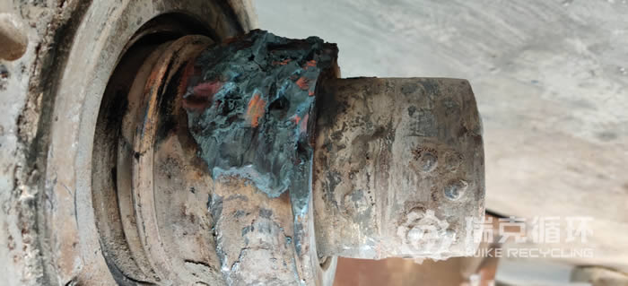 清洗拆解后發(fā)現(xiàn)轉(zhuǎn)子下端推力軸承已經(jīng)損壞,軸端有補(bǔ)焊痕跡,改變了軸端材質(zhì)并伴有嚴(yán)重形。此用戶在不明主軸材質(zhì)情況下就敢補(bǔ)焊軸端磨損處,并且焊工粗糙不但改變了軸端材質(zhì)而且有嚴(yán)重的安全隱患。立式復(fù)合破轉(zhuǎn)速高并且對動平衡要求苛刻,一旦平衡被破壞就會造成嚴(yán)重的生命財產(chǎn)損失。