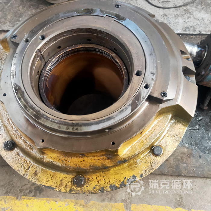 架體銅套磨損嚴重,偏心銅套燒傷,更換架體銅套及偏心銅套,活塞內外壁光滑無需處理,偏心套部正常磨損尺寸復檢合格無缺陷可以繼續使用。大小齒輪接觸率符合要求可繼續使用,其余外觀處理做好裝機前準備。
