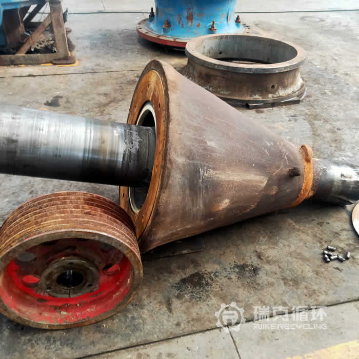 動錐部主要對主軸下部及軸套安裝部位進行拋光處理,以適應新銅套磨合,上部軸套換新,參與運行的各零部件及密封都要更換,保證主機運行平穩且不漏油。主機皮帶輪拋光處理,動錐襯板更換新件。