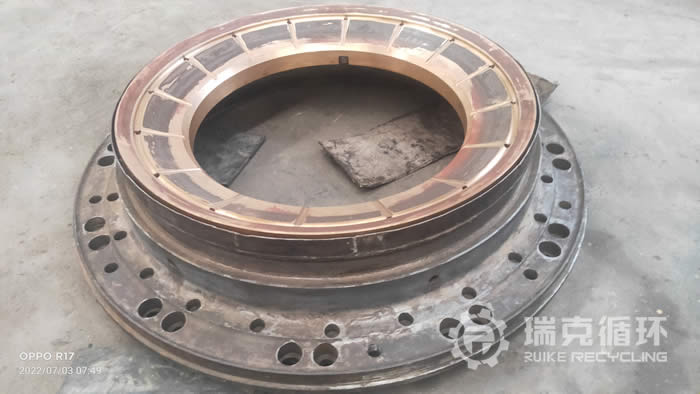 對主機進行拆解、清洗、測量,然后根據各部位配合尺寸的磨損情況,出詳細的檢修方案,方案經技術、質檢、生產統一審核后才能開始施工,主軸和軸瓦配合面需要檢測接觸率,研磨后接觸效果要在70%以上,油槽磨損不得大于1mm。如有差異較大需上機床維修以至于達標。襯板磨損還算可以就不再做調整了。